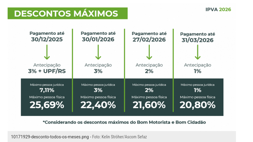 Quem quitar o tributo até 30 de dezembro terá desconto de antecipação de 3% e não incorrerá na variação da UPF/RS (estimada em 4,43%), gerando uma redução potencial de 7,43%. Mas as vantagens podem ser ainda maiores para os proprietários de veículos que tiverem os descontos de Bom Motorista e Bom Cidadão. No IPVA 2026, a soma dos benefícios deve chegar a R$ 328 milhões.